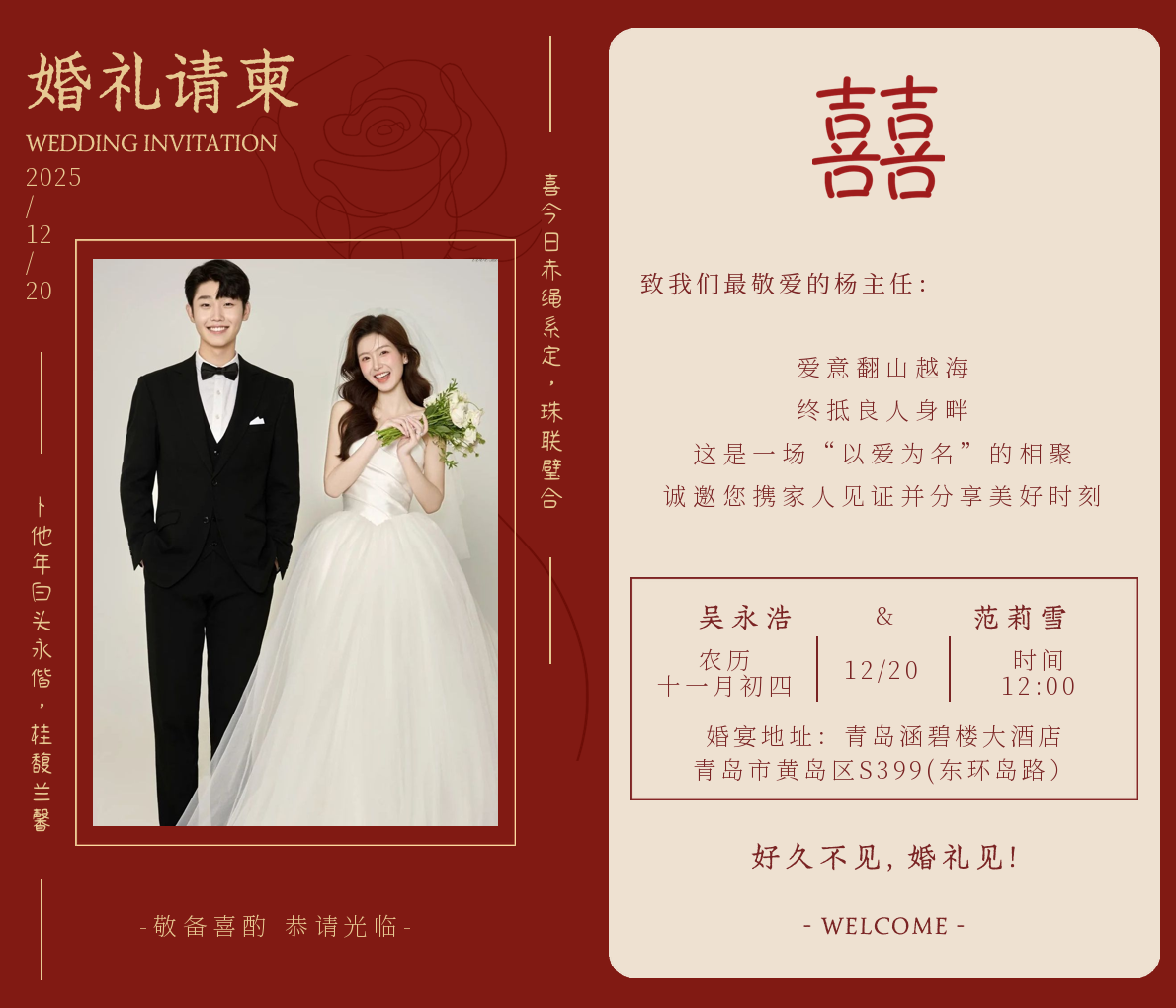本人 XXX 与我的爱人 XXX,将于____年___月____日____时____分,在XX酒店举行婚礼,特设宴席邀您共同见证!