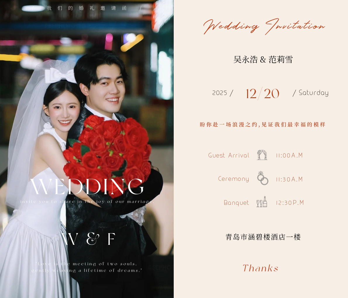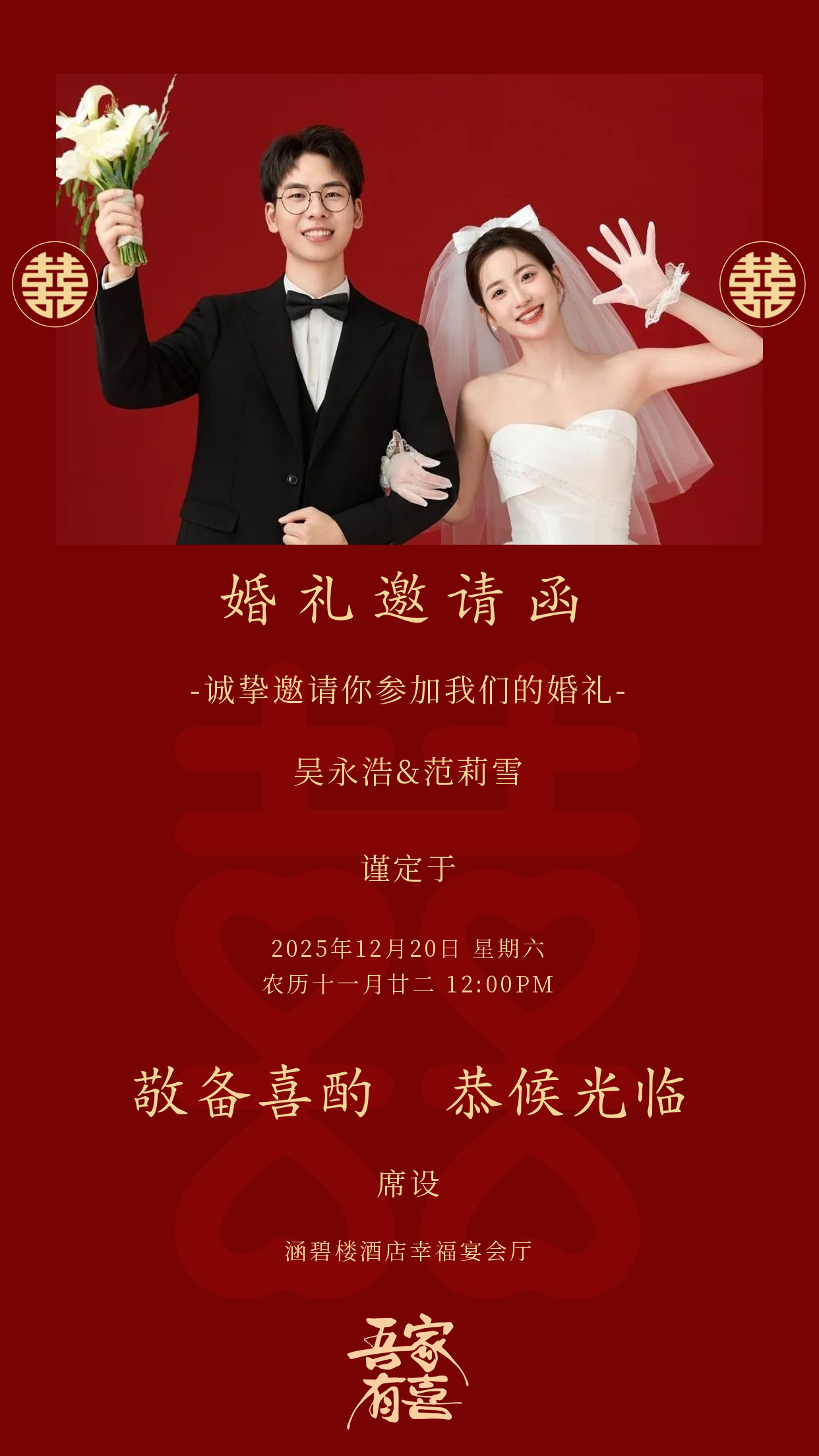 谨于公历____年5月20日上午___时___分、下午___时___分于____举行婚礼,恭候您携家人入席,新郎____新娘___敬备薄酌恭候光临。祝您一生平安!