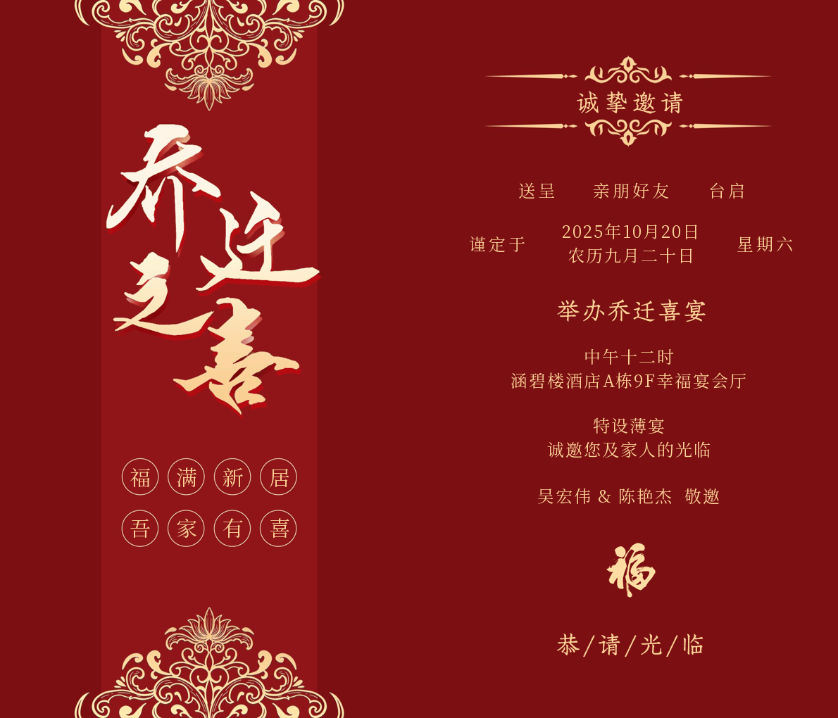 新居乔迁之喜是一大喜事,而将这份喜悦与亲朋好友分享更是喜上加喜。