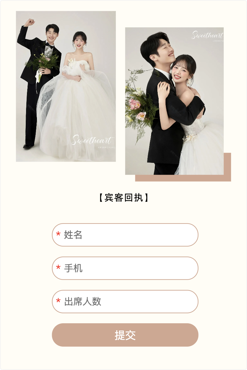 提示:务必在邀请函上醒目地标注“敬请赐复”的截止日期,婚贝请柬邀请函支持宾客填写赴宴功能,填写后可查看宾客出席情况。