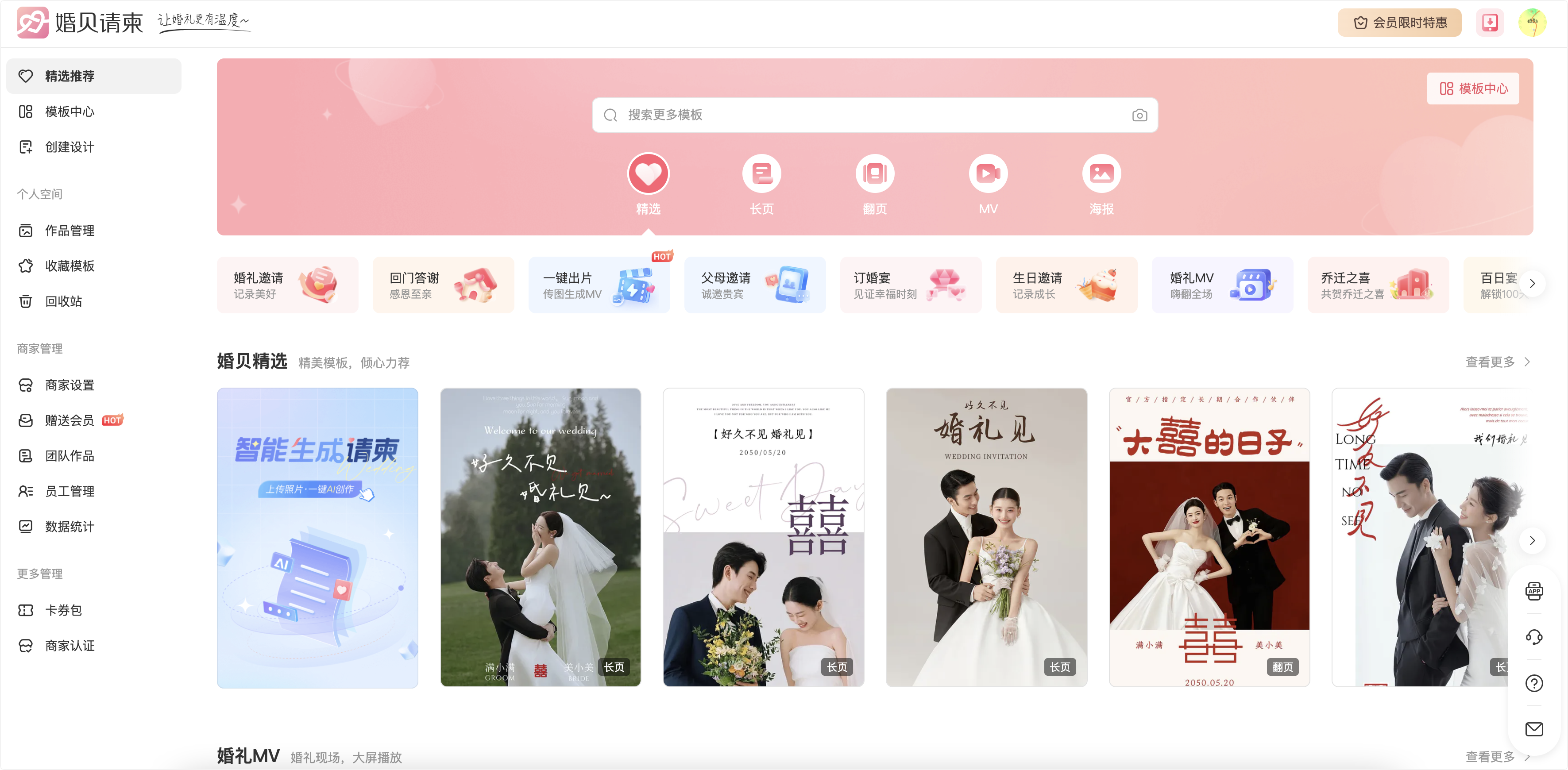 备婚新人看过来!制作精美婚礼邀请请柬,可以省时又省钱!推荐使用婚贝请柬请帖制作小程序,无需下载,海量免费模板随心切换,修改文字和图片即可快速生成免费电子邀请函,轻松提升婚礼仪式感。
