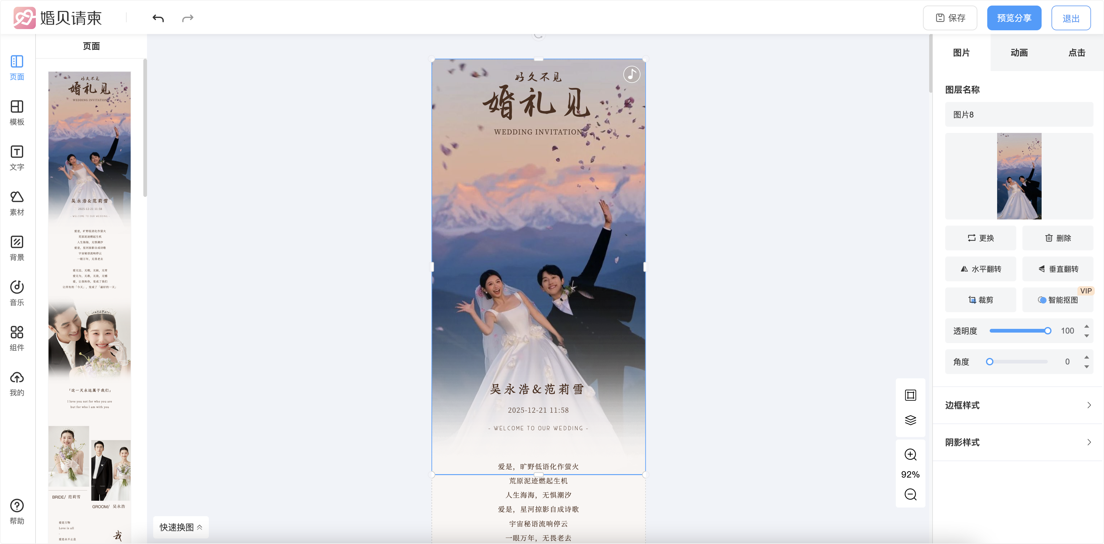 选择心仪的模板,点击【立即制作】即可进入编辑器。您可以自由替换图片和文字,快速生成专属邀请函。