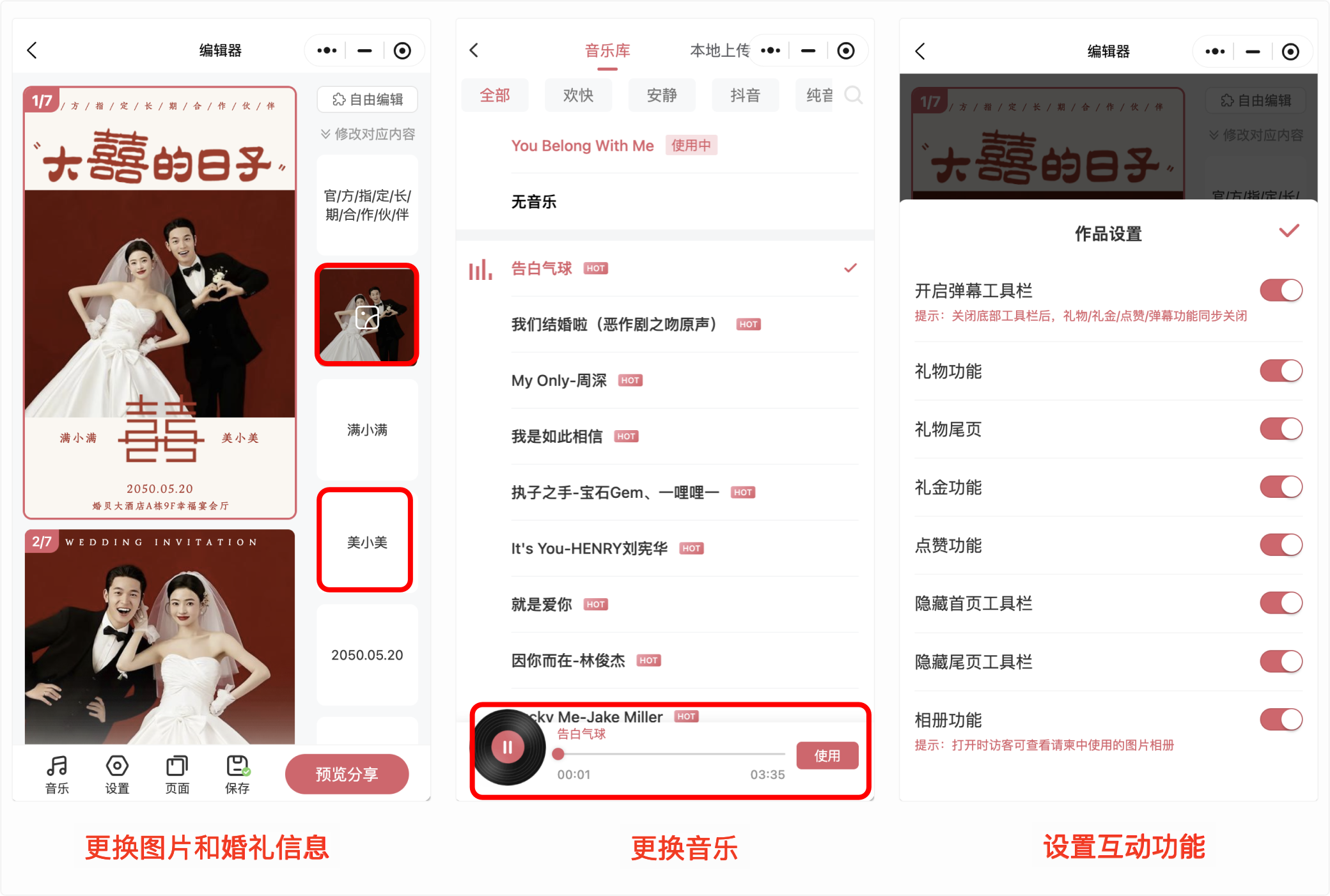 第一步替换图文:直接点击右侧的图片或文字,可上传照片、修改婚礼信息。