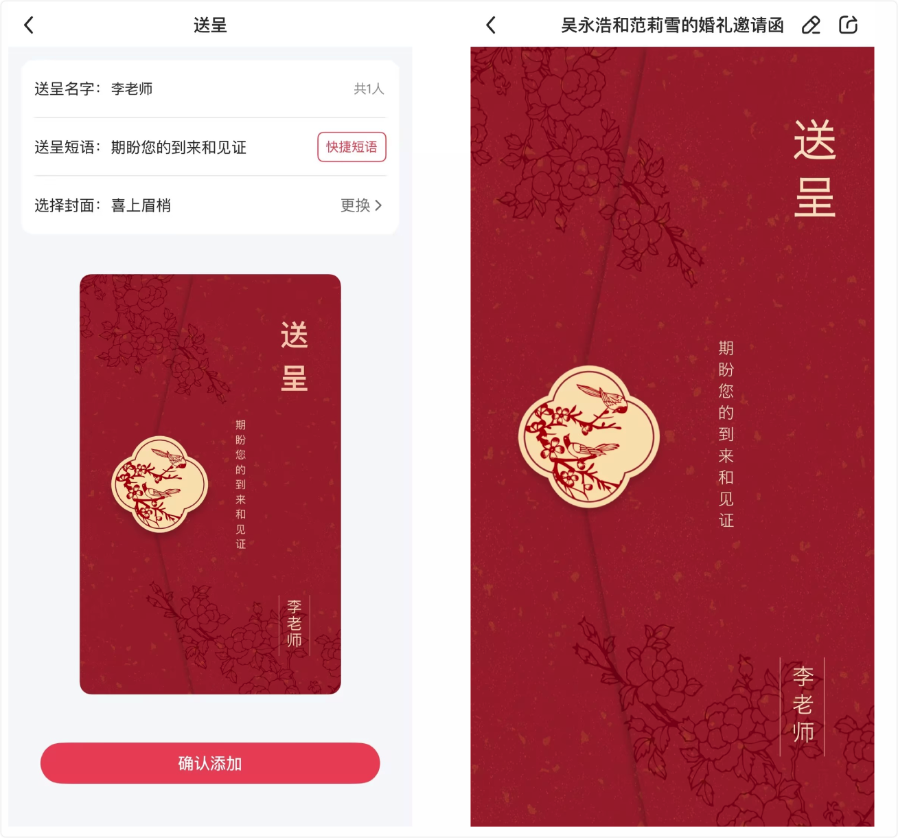 在婚贝请柬可以制作电子邀请函,还可以添加电子送呈页面,分享给专属亲友更得体!