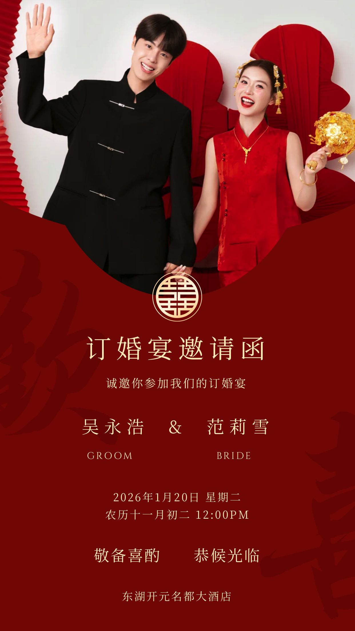 由双方家庭共同拟定名单,涵盖直系亲属、近亲及证婚人等重要嘉宾。邀请可通过电话、纸质请柬或电子请柬发出,请柬中请清晰注明仪式时间、地点与流程安排,在婚贝请柬小程序和婚贝请柬APP,免费制作订婚宴邀请函微信模板,可分享给亲友。筹备仪式物品