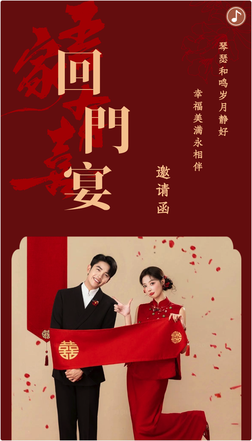 准备回门宴请邀请函,现在多数以电子邀请函为主,在婚贝请柬小程序可以免费制作回门电子邀请函,得体大方的邀请亲朋好友相聚,共享人生中这份最珍贵的幸福时刻。