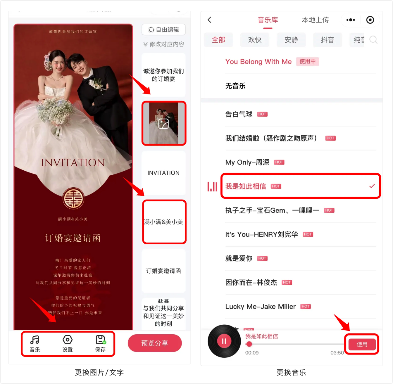 直接点击请柬上的图片或文字区域,上传您的照片、修改订婚信息内容。请柬作品中默认带有音乐,也可以点击下方“音乐”按钮,从曲库挑选,或上传本地歌曲。完成后点击“预览分享”,预览请柬内容。