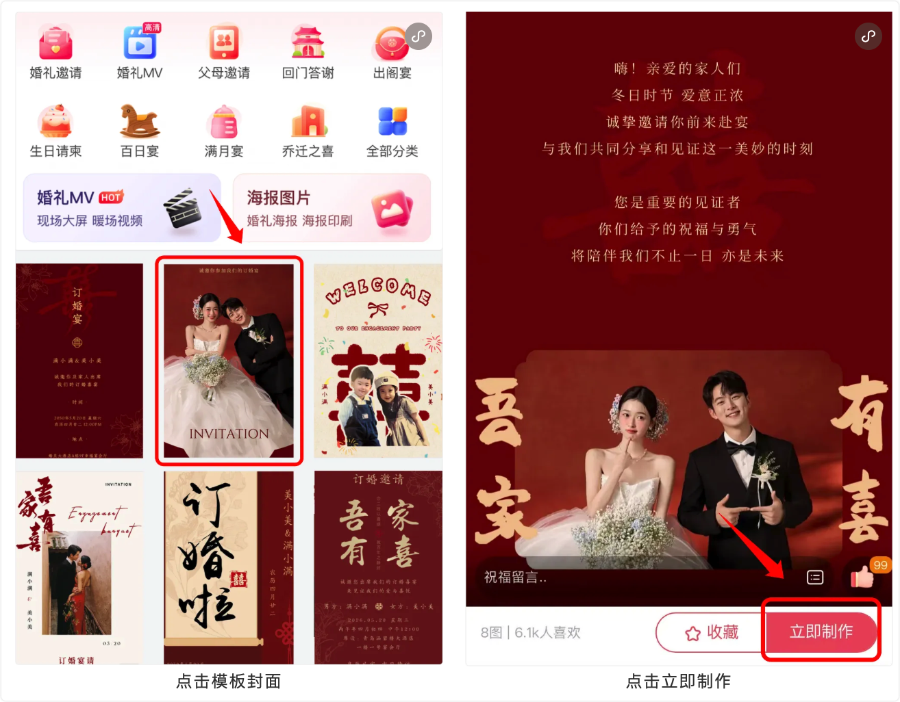 选择心仪的模板,点击【立即制作】即可进入编辑器。您可以自由替换图片和文字,快速生成专属邀请函。