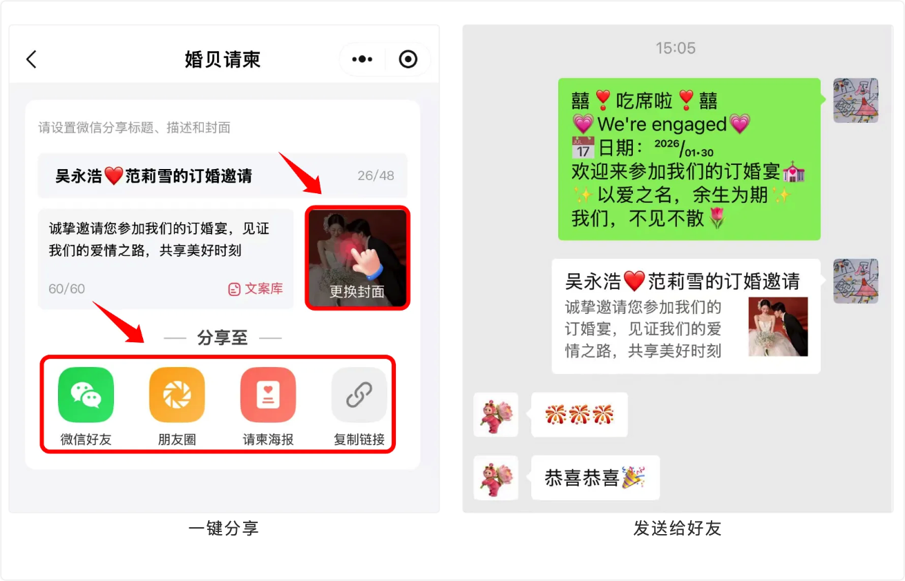 在编辑器中点击预览分享,修改好封面后,可将婚礼请帖分享给微信好友、朋友圈等。