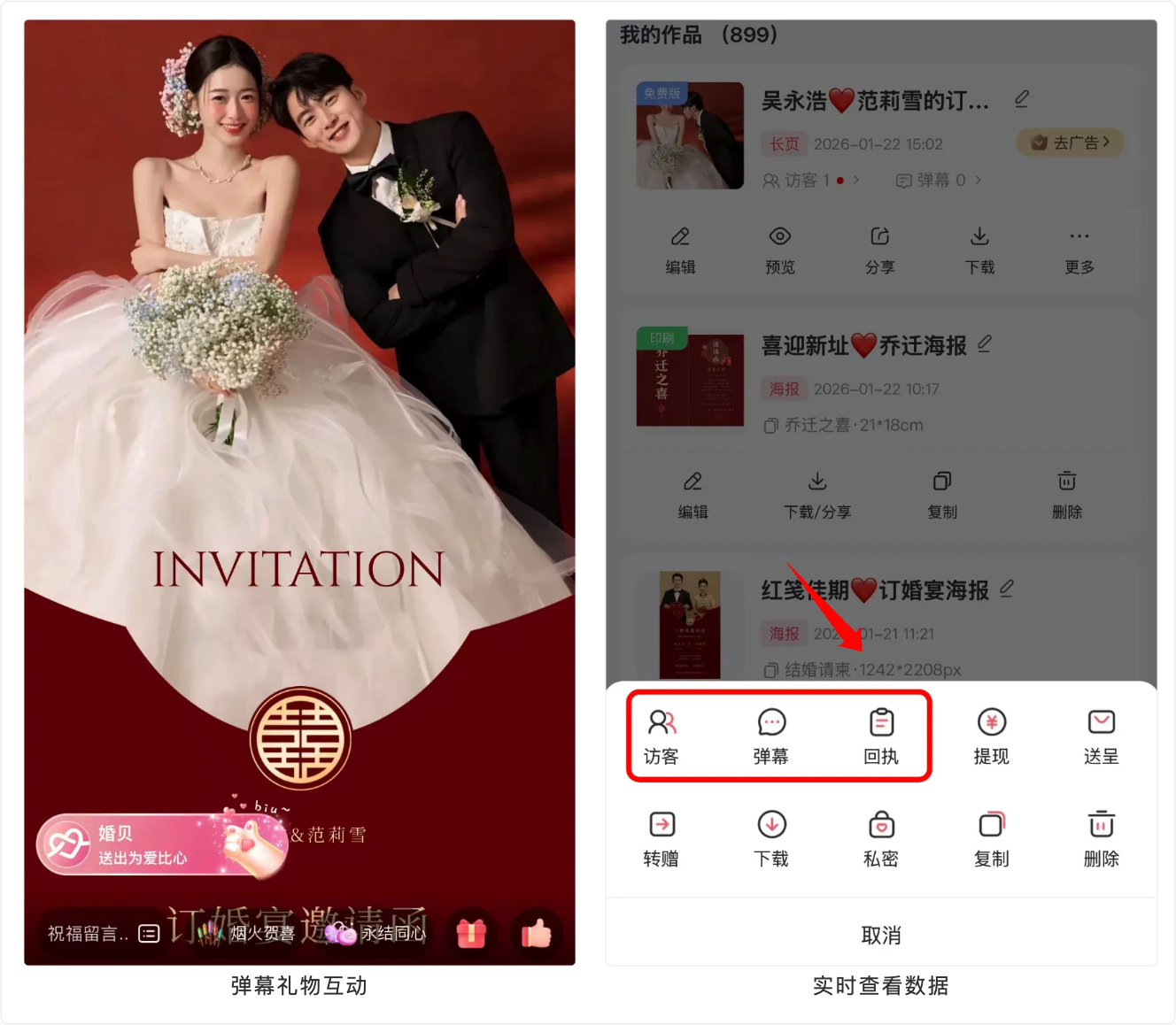 将订婚请柬分享给亲友,亲友发送的弹幕祝福可以实时回复;亲友赠送的每一份礼物与心意都有清晰记录;您还能随时查看访客功能与宾客赴宴回复,助您从容筹备,完美迎接盛宴。