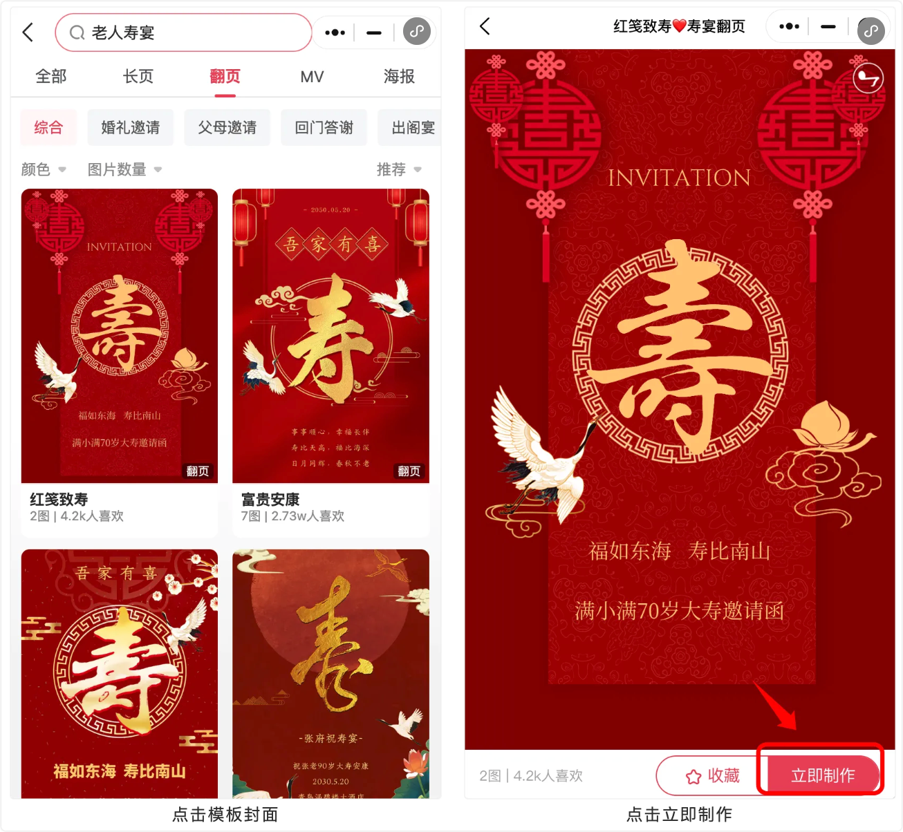 搜索“老人寿宴”挑选喜欢的模板,点击模板封面,再点击【立即制作】进入编辑器。