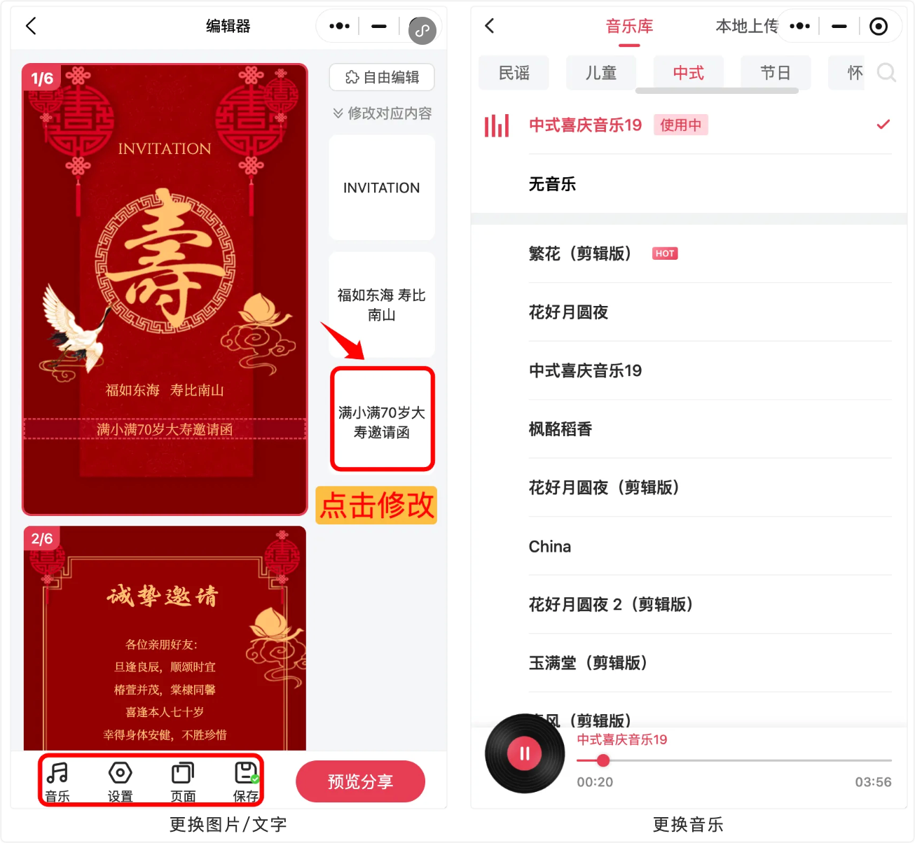 进入编辑器后,直接点击右侧的图片或文字区域,即可上传您的幸福照片、修改文案信息。