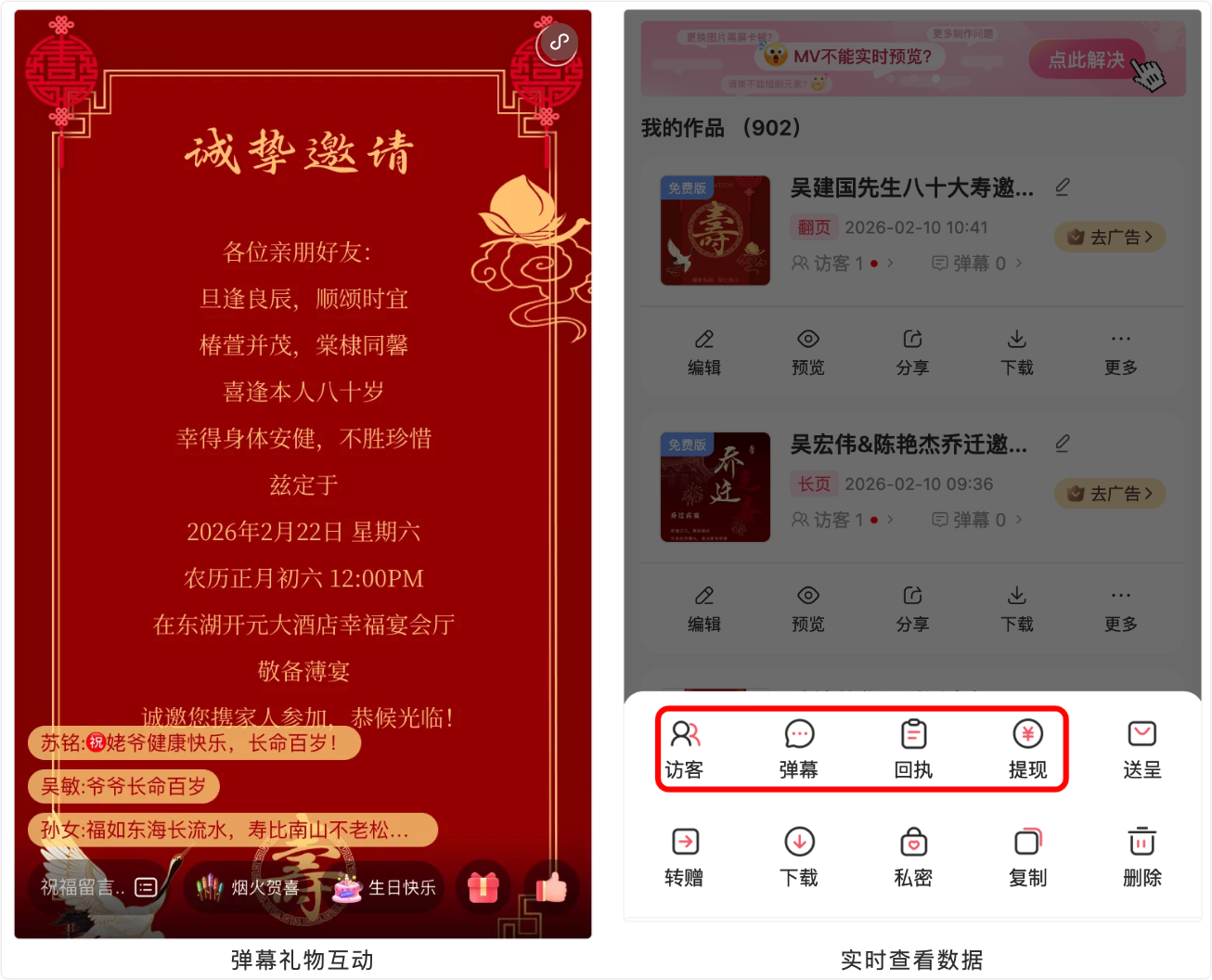 将您的请柬分享给亲友,即刻开始收集满满的祝福!宾客发送的弹幕留言会实时呈现,让互动更有趣;所有礼物礼金详情清晰可查,让每一份心意都不被遗漏。同时,通过直观的访问数据与赴宴回复,轻松跟进宾客情况,为您的盛宴做好万全准备。