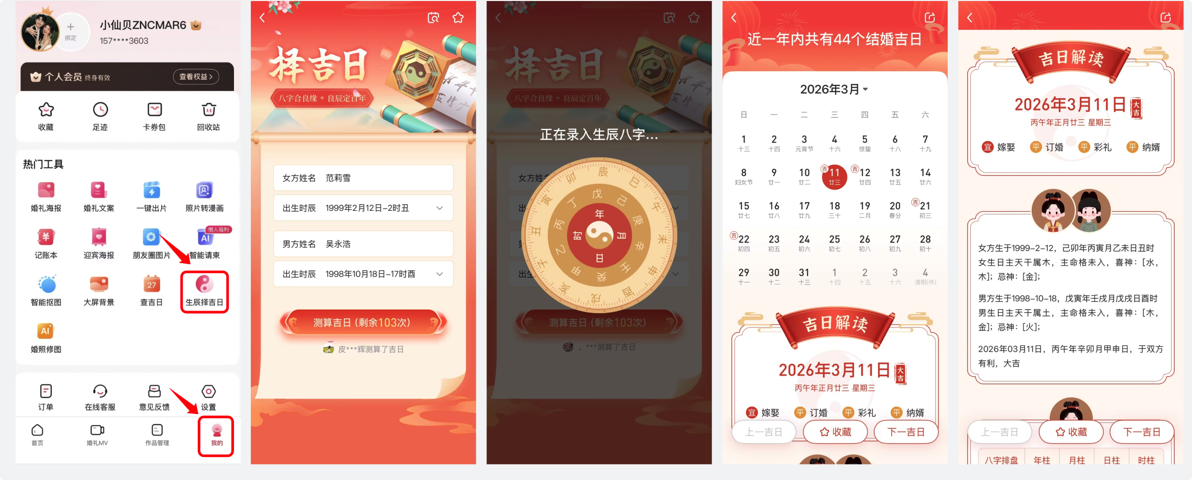 几秒钟,专属你们的结婚吉日即刻生成。还可以查看双方命格、命盘、五行等深度信息,让每一个选择都有据可依。