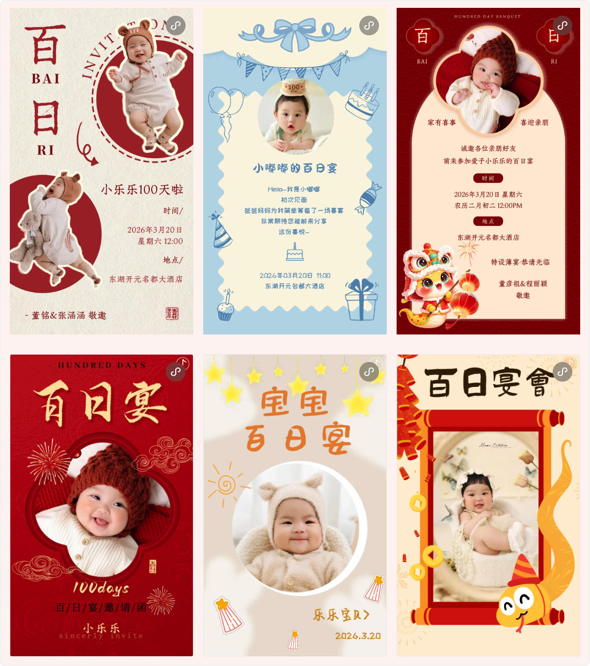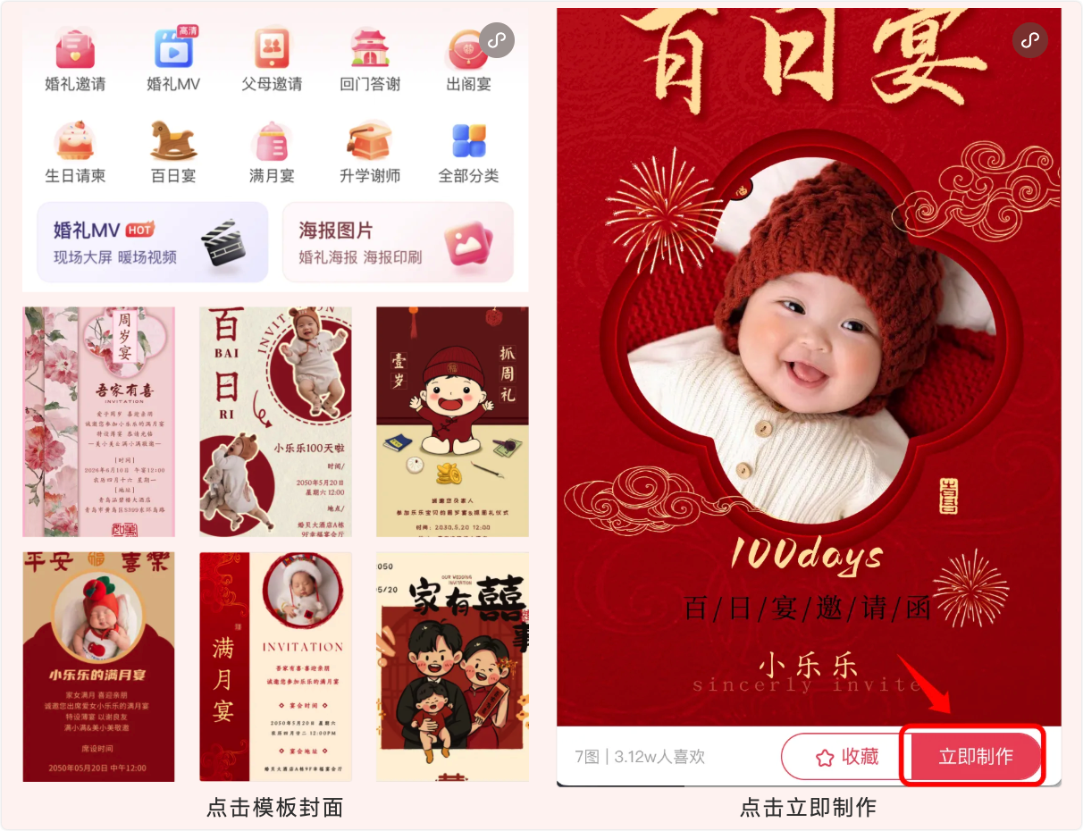 宝宝的百日宴,您想如何记录这份感动?用婚贝请柬的邀请函模板和分步教程,百日宴邀请函免费制作模,只需简单几步,就能亲手制作一份充满爱意的请柬,将幸福时刻传递给每一位亲友。