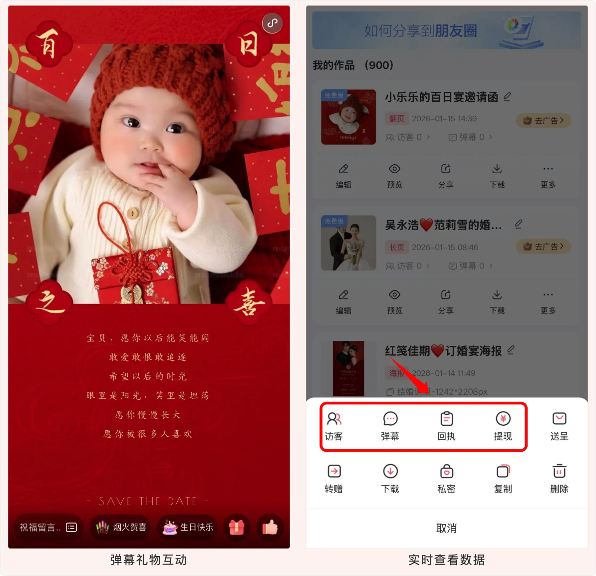 将您的请柬分享给亲友,宾客的弹幕祝福可实时展示,礼物礼金明细一目了然。此外,通过访客与赴宴回复,便捷跟进宾客动态,助您从容筹备完美盛宴。