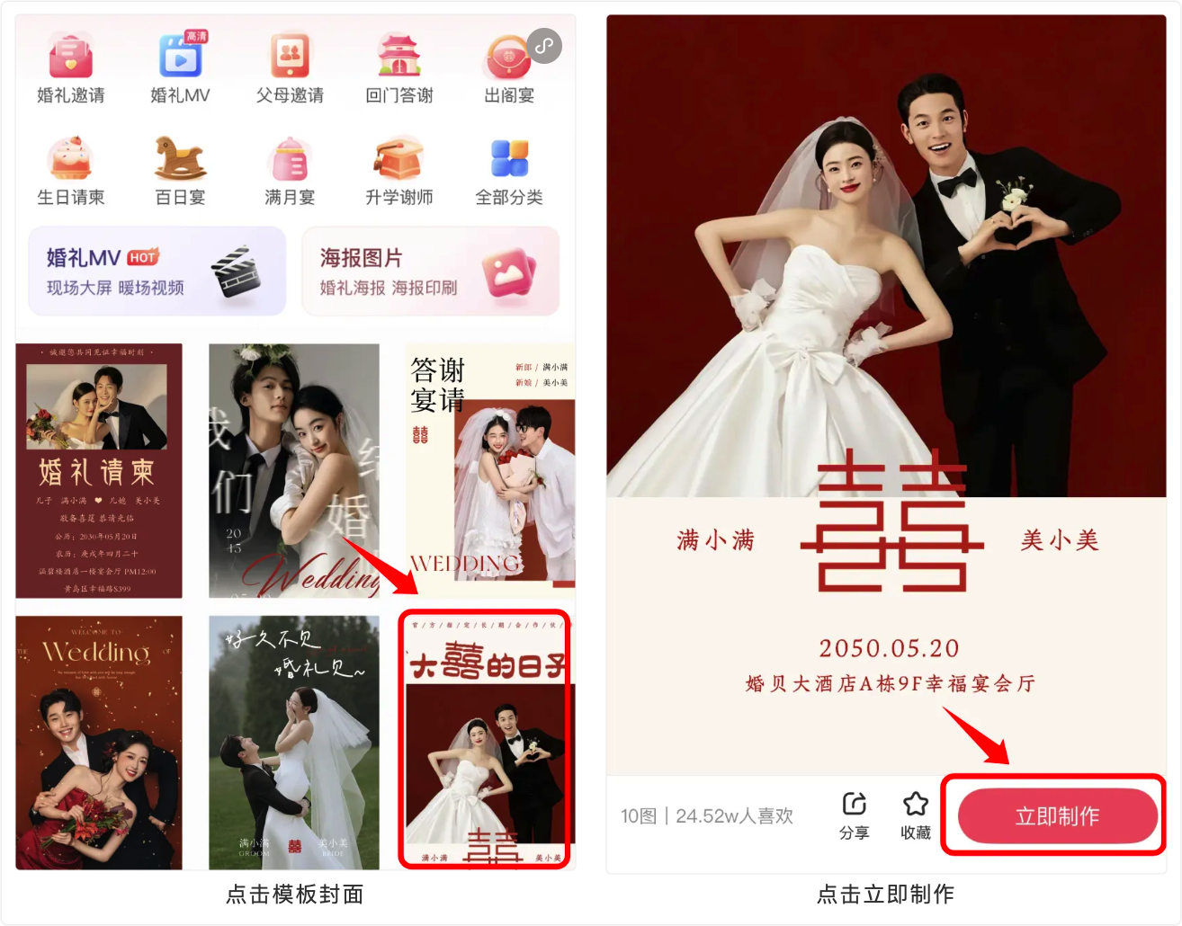 选择婚礼邀请函模板,点击【立即制作】即可进入编辑器。