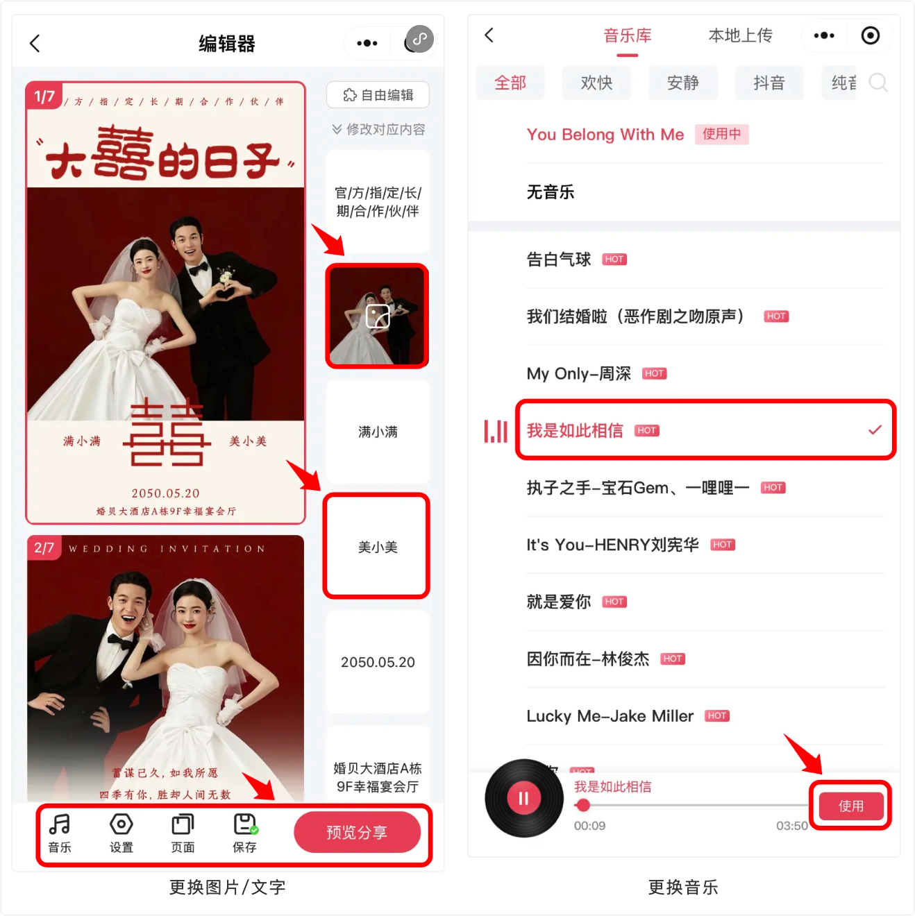 进入编辑器后,点击右侧的图片或文字区域,可上传照片、修改文案信息。点击编辑器下方的“音乐”按钮,可以从曲库选择或本地上传背景音乐;点击“页面”可调整页面顺序。