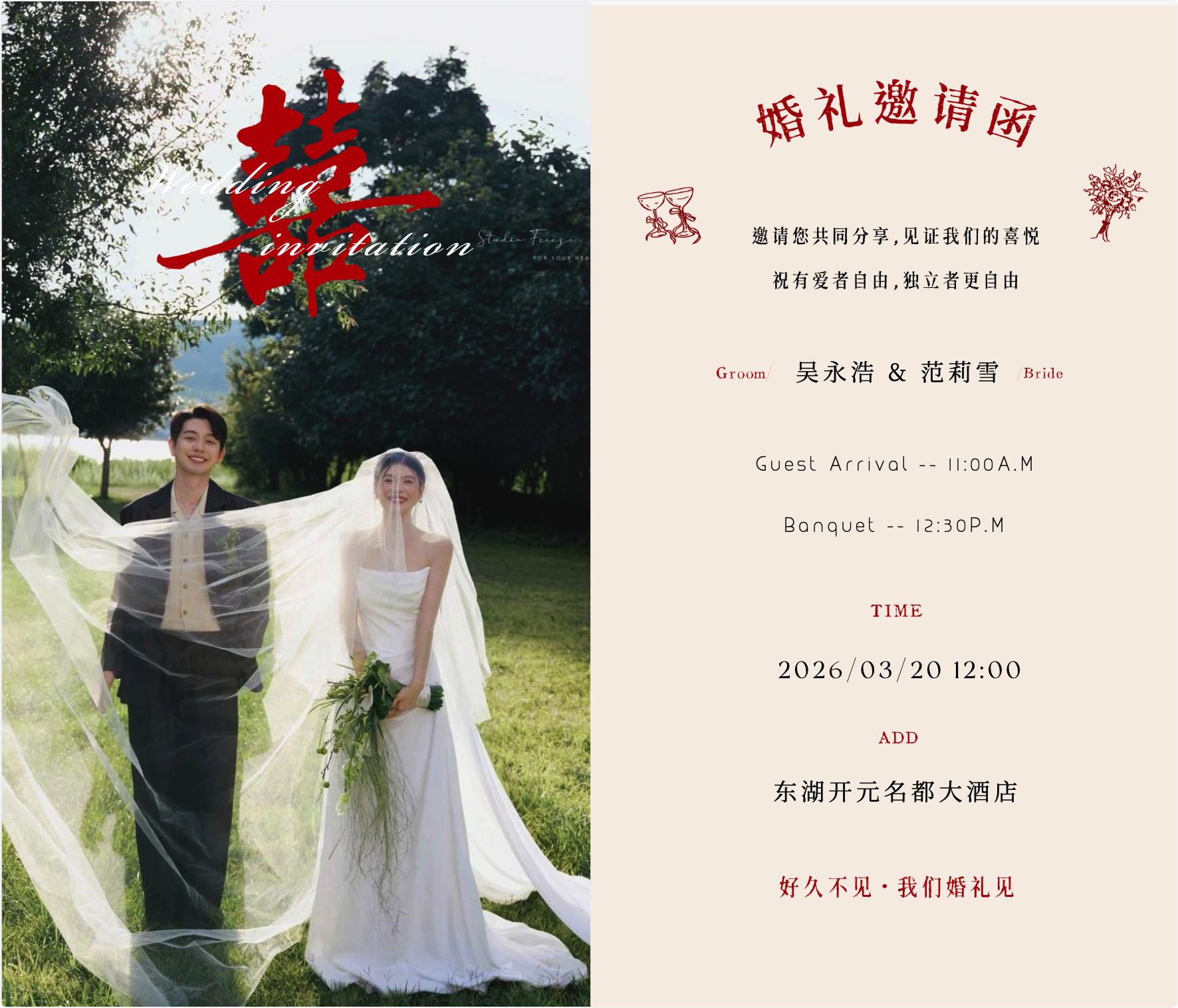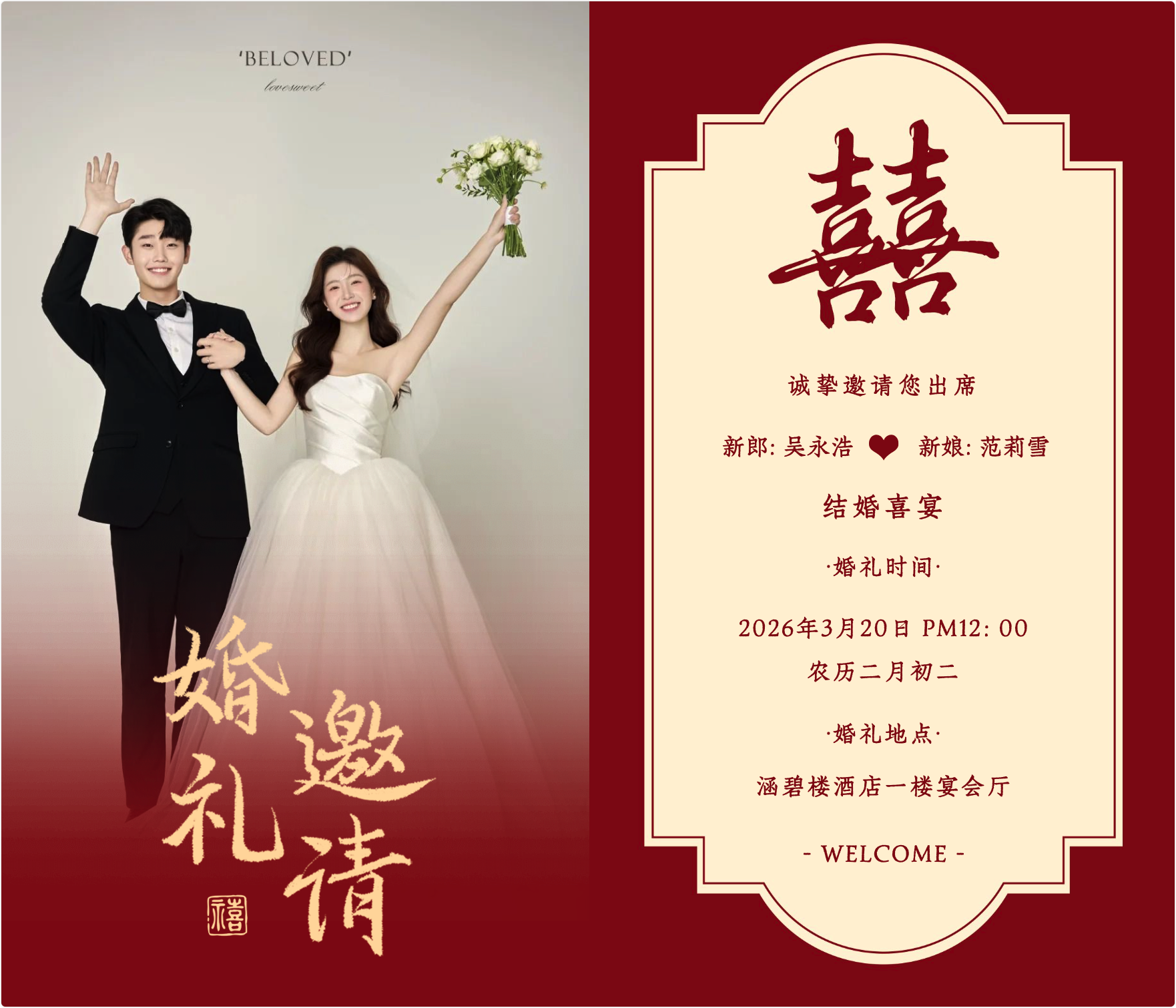 备婚事项繁多,不如让请柬准备这件事变得简单一点!婚贝请柬已为您备好多套高颜值的请柬模板和婚礼邀请文案,您只需轻松几步,即可拥有专属的结婚邀请函,省下时间去享受备婚的甜蜜。