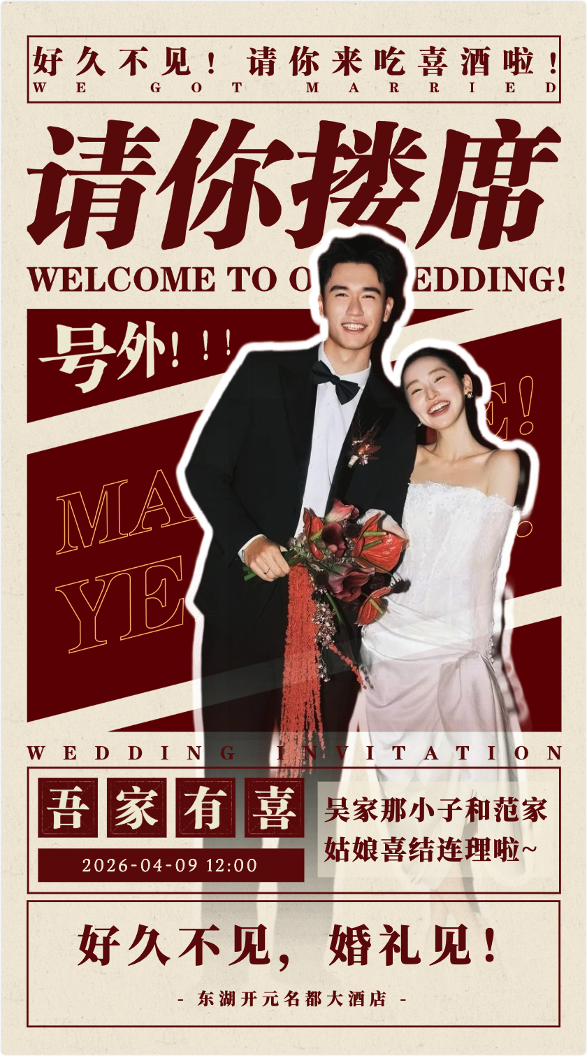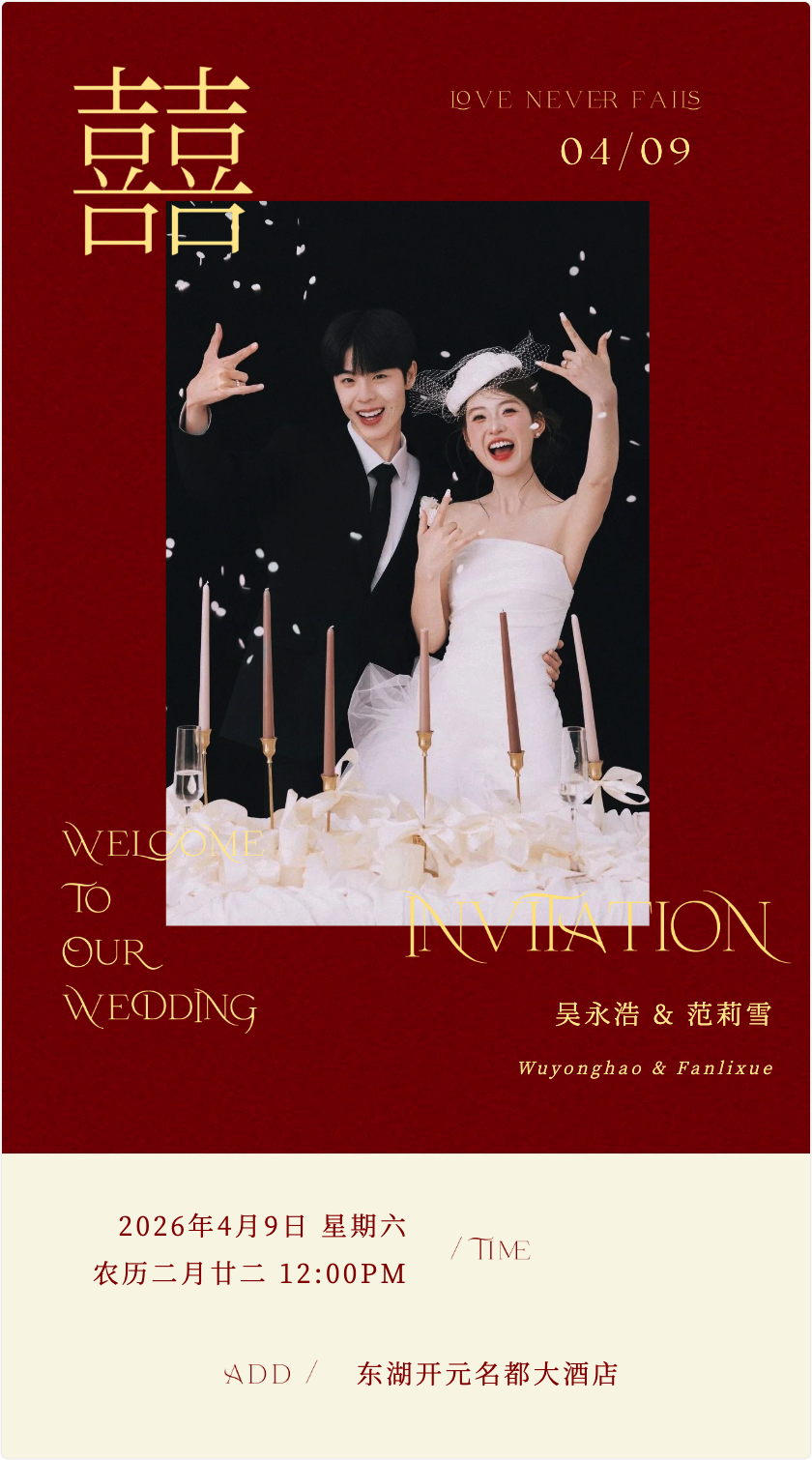 谨定于公历2026年3月20日(星期五)举行结婚典礼,敬备喜宴,诚邀您携家人光临,见证我们的幸福时刻。