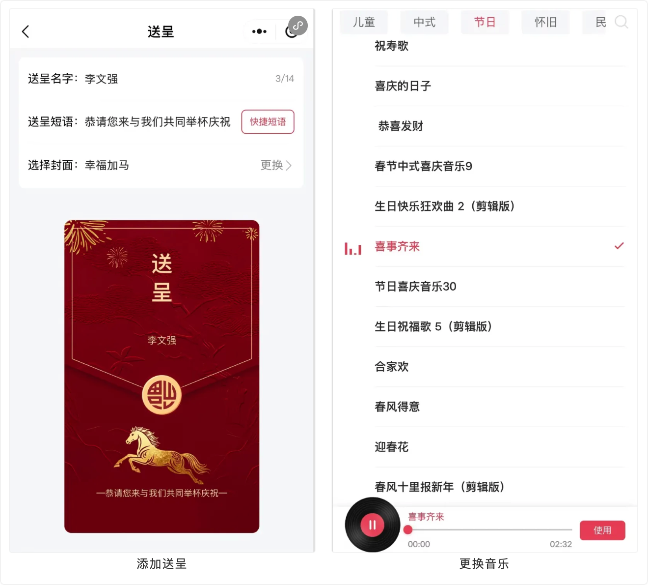 长页和翻页请柬都自带音乐,但如果你想更有仪式感,可以点击编辑器下方的【音乐】按钮,从库里挑一首喜庆的歌,或者上传你们喜欢的曲子。朋友一点开,氛围感就有了!