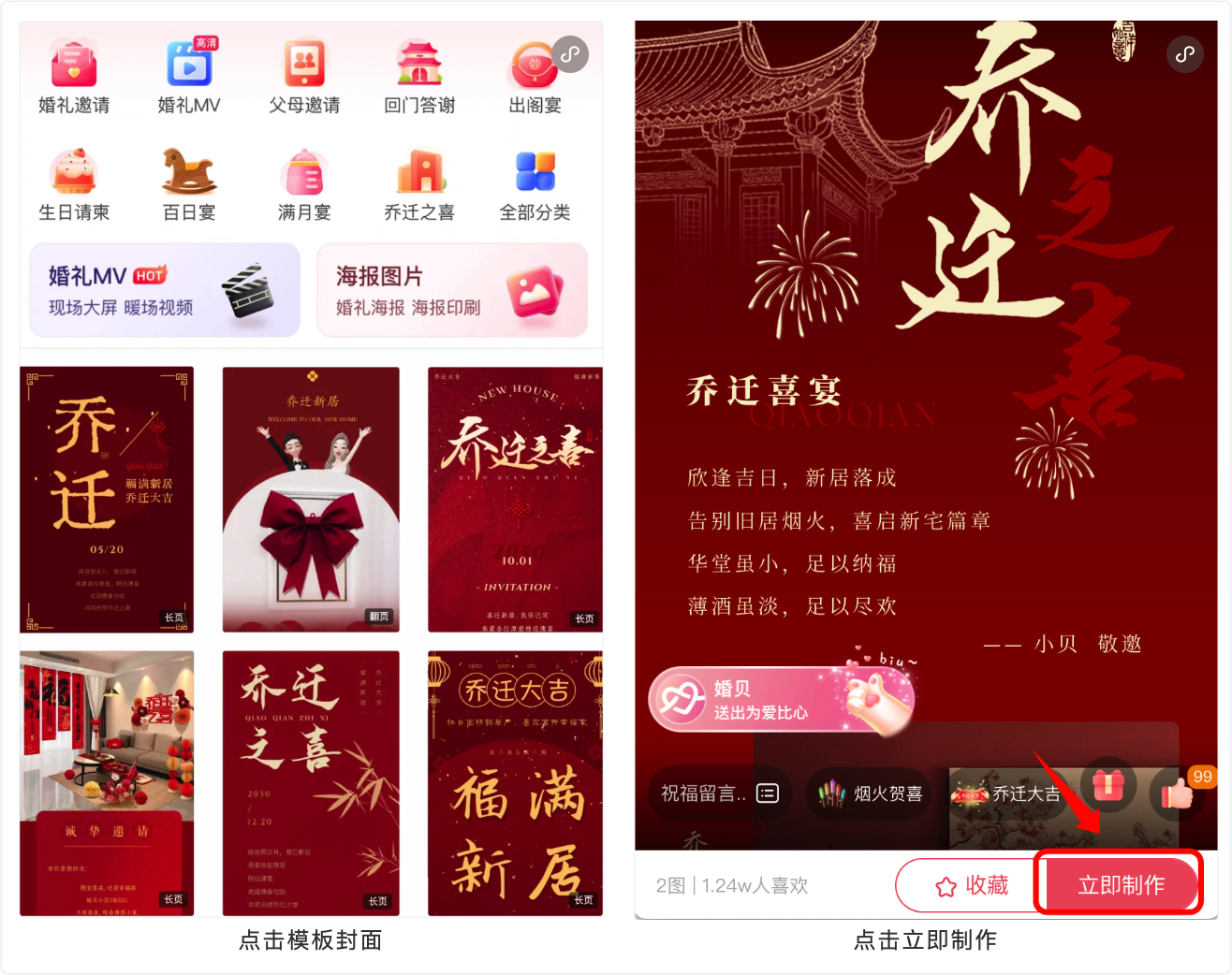 进到首页后,点击【乔迁之喜】,挑你喜欢的风格。看中哪个封面,点进去预览一下,觉得不错就直接点【立即制作】,进入编辑页面。