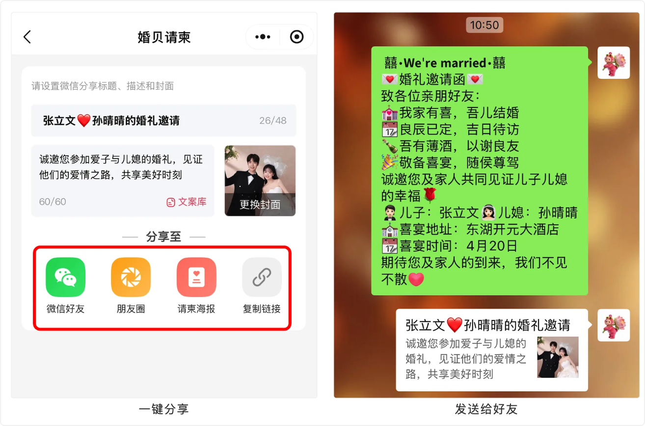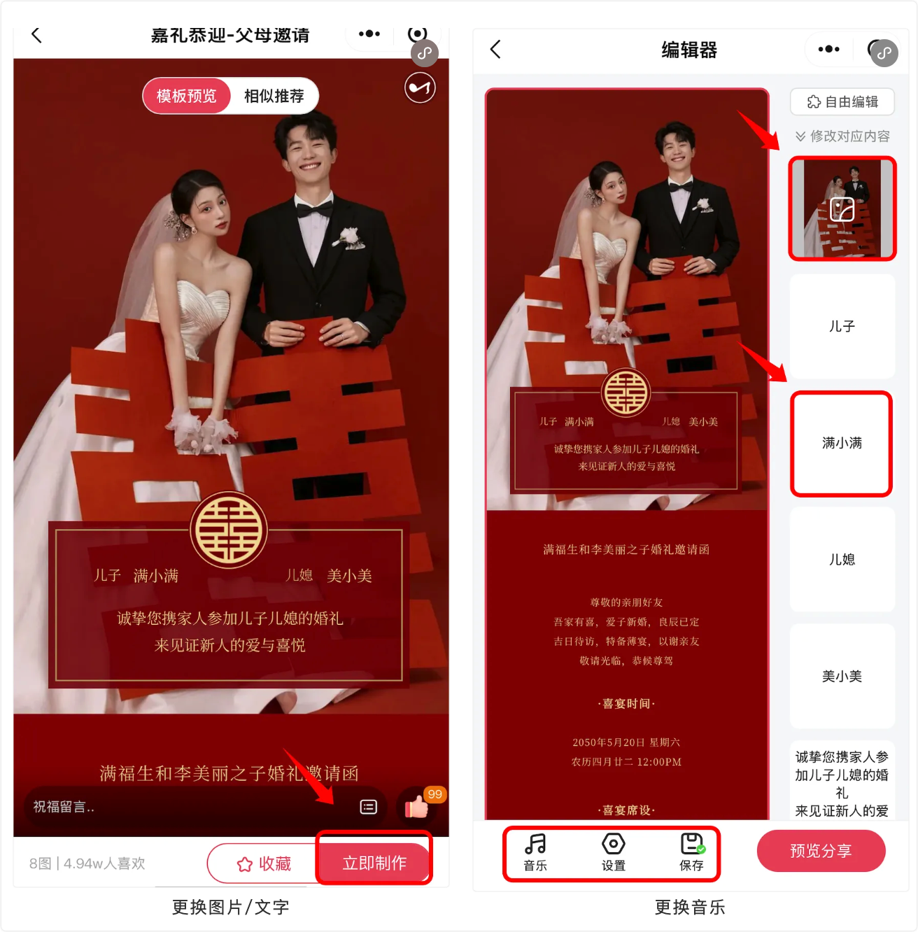 点请柬上的文字,把孩子的名字、婚礼日期、酒店名称打进去就行。