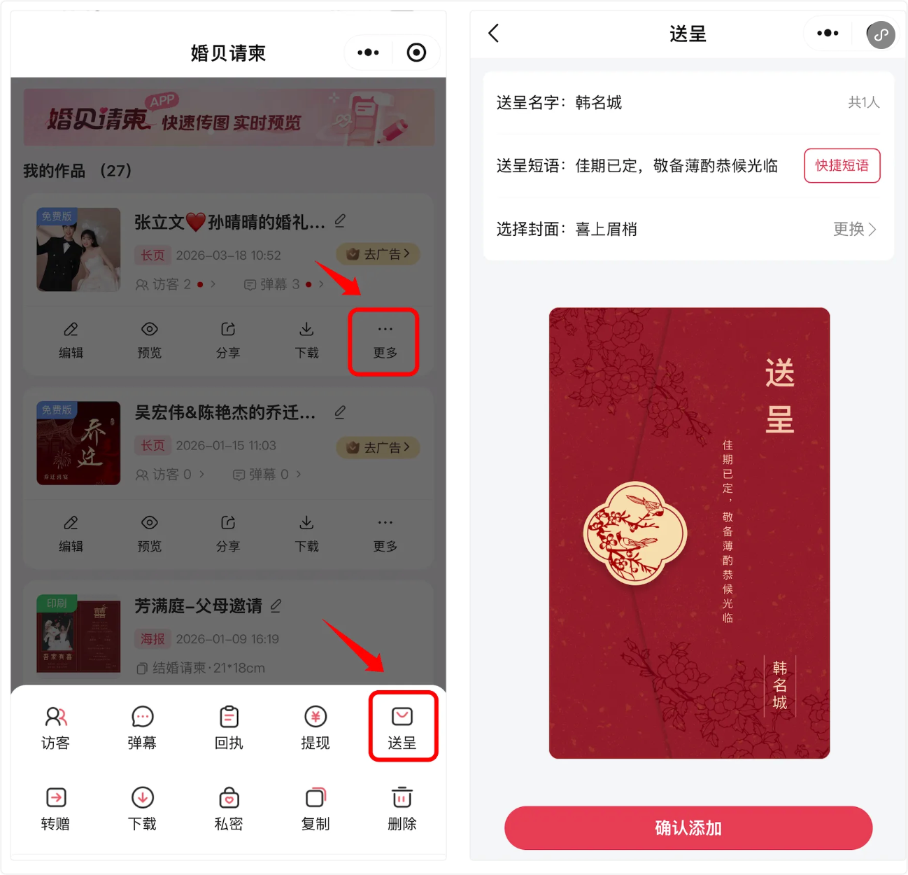 为特别的人,准备一份特别的邀请。在「作品管理」页面点击【更多-送呈】,为宾客添加一个邀请专属首页,让受邀时刻,满载这份专属的郑重。