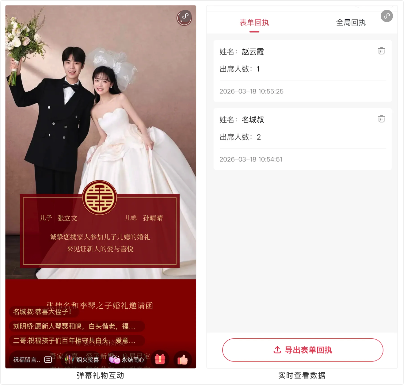 等亲友回复得差不多了,点「导出表单回执」,所有宾客信息自动生成一张表格。安排酒席桌数、排座位,拿着这份名单,心里特别踏实。