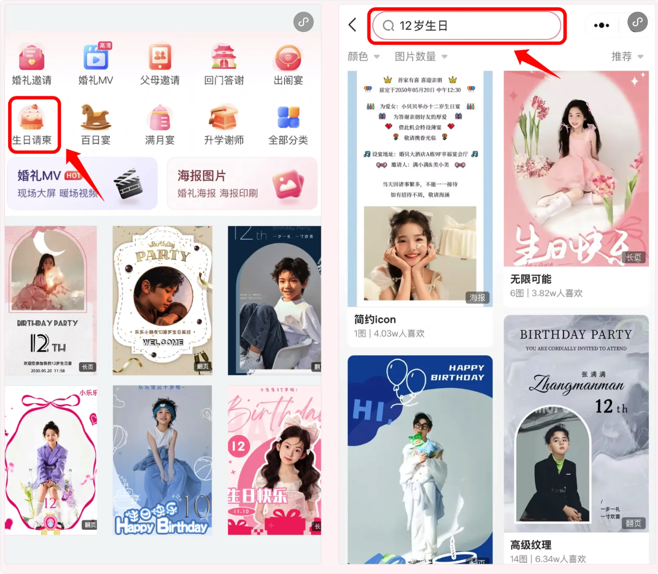 在微信搜索“婚贝请柬”,进入小程序后,点击首页的 【宝宝生日】 分类,里面就有12岁生日邀请函的模板;或是直接搜索“12岁生日”就可以筛选喜欢的模板。