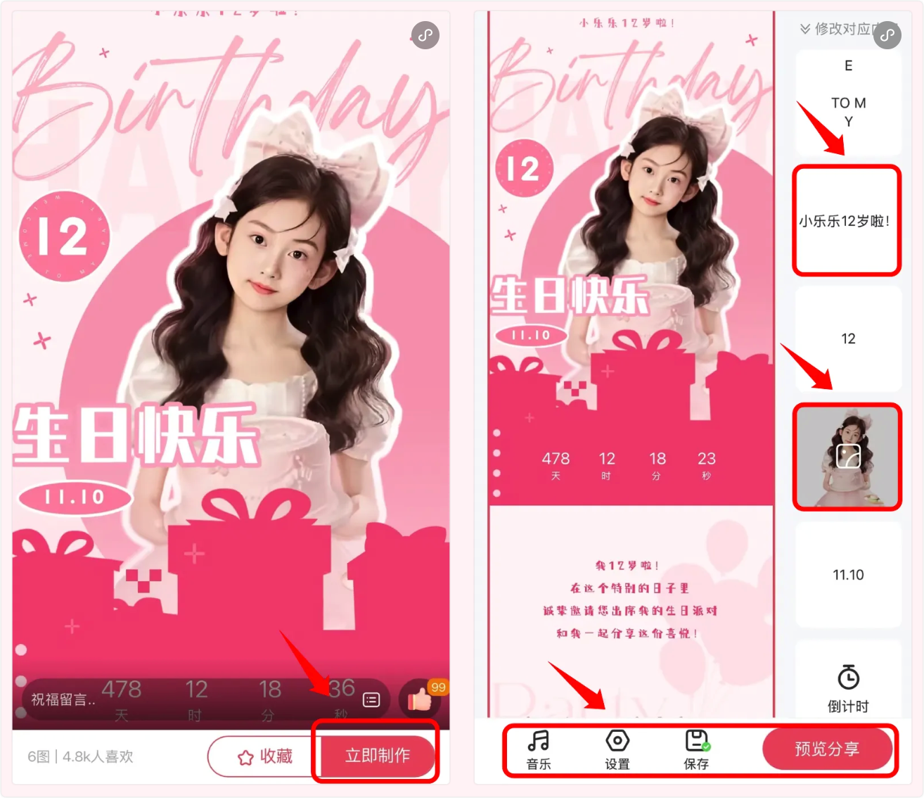 点开一个您喜欢的模板,点一下文字就能改——把孩子名字、日期、酒店地址填上就行。照片也能换,换上孩子的近照,更亲切。