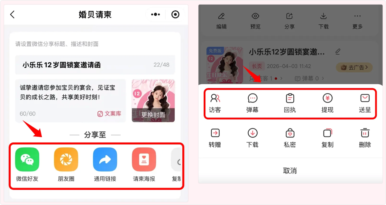 改完以后,点【分享】就能直接发给微信好友,或者发到家族群、朋友圈。亲友点开就能看,还能直接留言说要来几个人,后台自动帮您统计,到时候安排酒席心里有底。