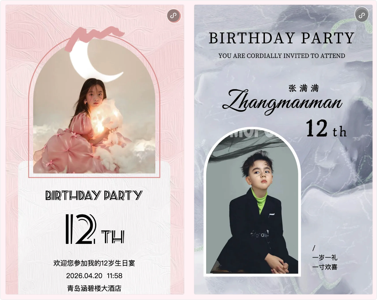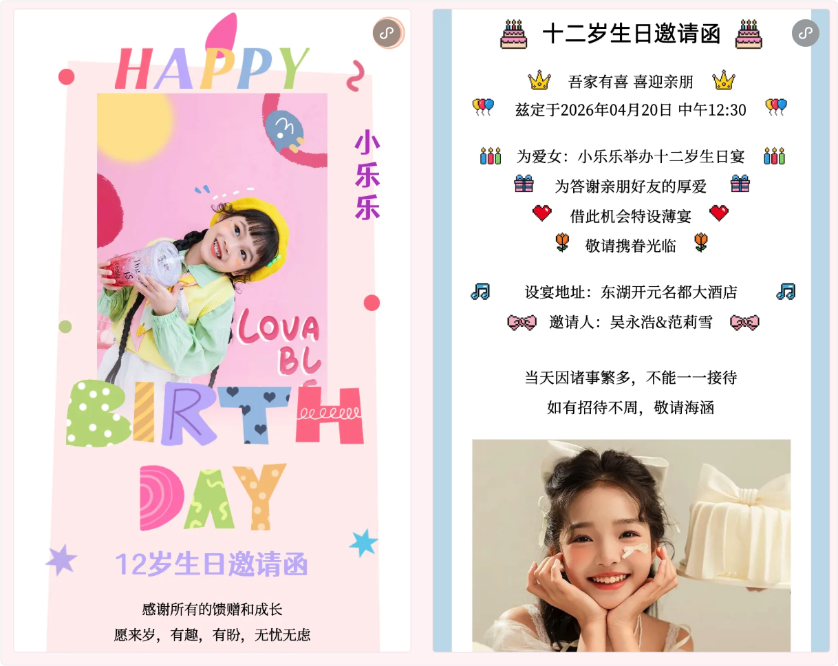 孩子的每一次成长,都是家里的大事。尤其是12岁圆锁礼,是孩子告别童年、开启少年阶段的重要时刻,办得体面些,既是对孩子的祝福,也是对亲友心意的回应。帮您整理了几款12岁生日邀请函电子版,在婚贝请柬免费制作,直接套用,换图即可,省心又体面。